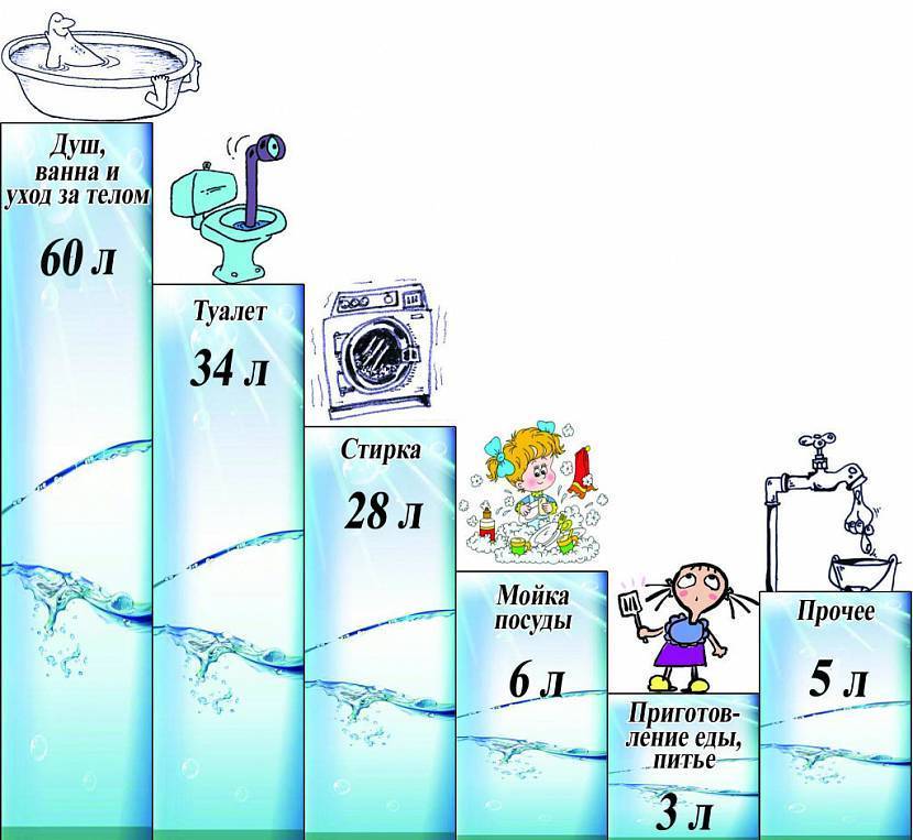 А есть и другие характеристики и показатели, на которые надо обратить внимание. Расход воды на бытовые нуждыИсточник vannayasovety.ru