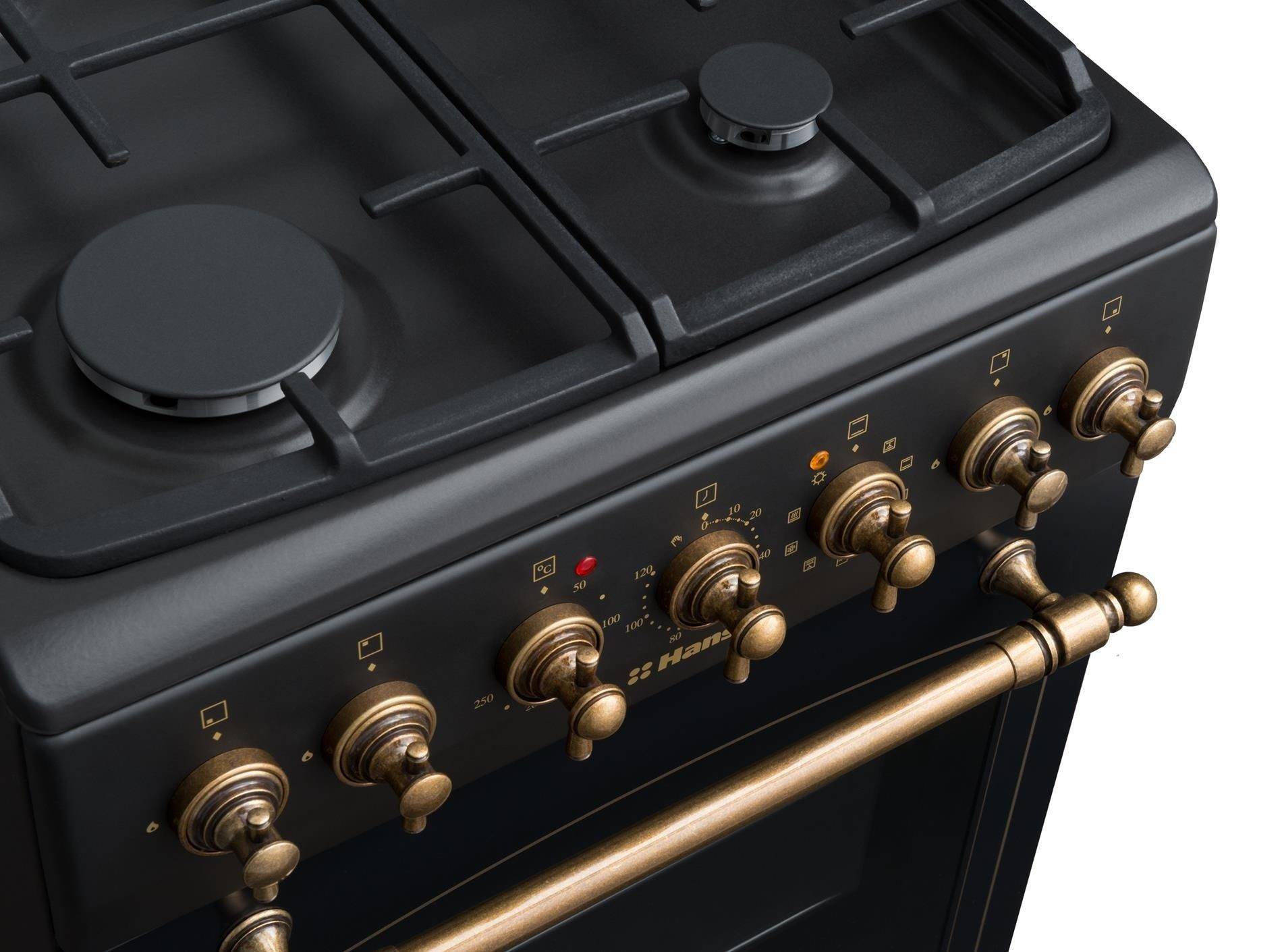 Стильная техника черного цвета, выполненная в ретро-стиле. При этом функционал у нее вполне современный: электродуховка, 7 режимов запекания, таймер, конвекция, гриль, поджиг. В общем, все, что необходимо для кулинарного творчества.