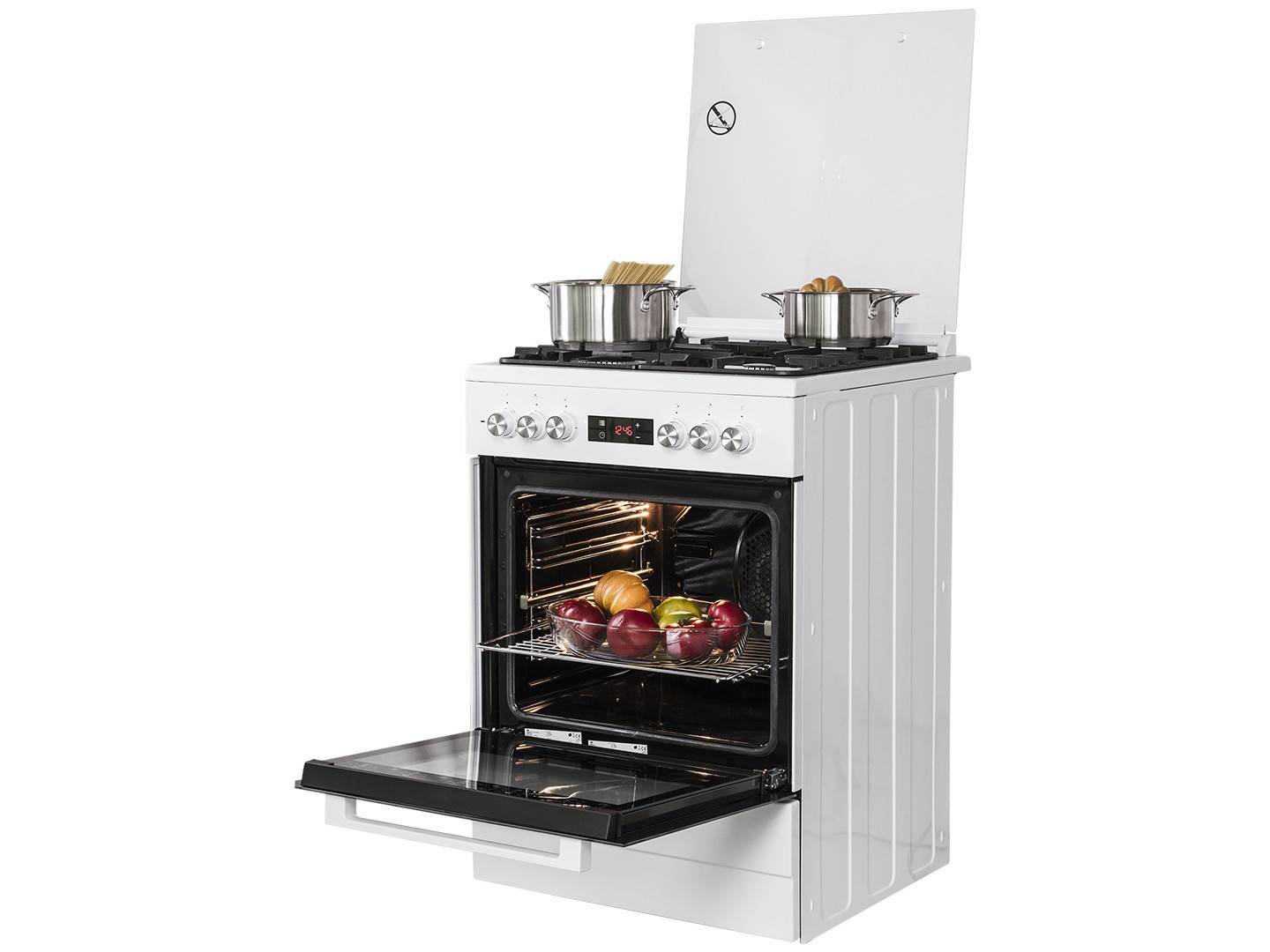 Модель оснащена тремя газовыми конфорками разного диаметра и одной электрической. Духовка имеет 6 режимов работы и гриль. Датчик температуры позволяет готовить пищу, не допуская пригорания. Имеется функция очистки паром внутренней поверхности духовки. Электронный таймер засекает время и отключает плиту по истечении заданного периода.