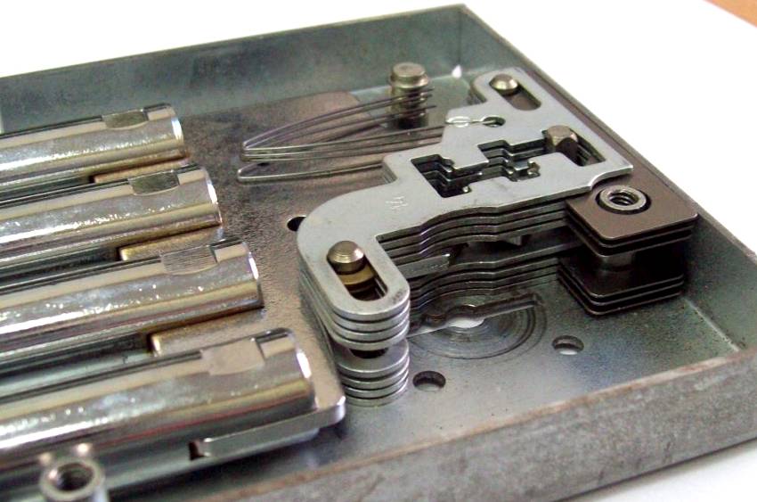 Если нужно починить замок, следует демонтировать его корпус. Сделать это несложно, открутив винты, удерживающие крышку. Под ней расположен секрет механизма в виде сувальд разной формы. Отведя в сторону пружины, эту стопку пластин можно достать, так как они нанизаны на специальный крепеж.
