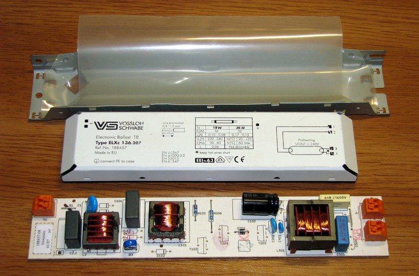Начнем с того, что люминесцентные лампы, к примеру, ЛВО 4×18, со старым блоком всегда мерцали и издавали неприятный шум. Чтобы этого избежать, необходимо подать на нее ток частотой колебания более 20 кГц. Для этого придется повысить коэффициент мощности источника света. Поэтому реактивный ток должен возвращаться в специальный накопитель промежуточного типа, а не в сеть. Кстати, накопитель с сетью никак не связан, но именно он питает лампу, если случиться сетевой переход напряжения через ноль.
