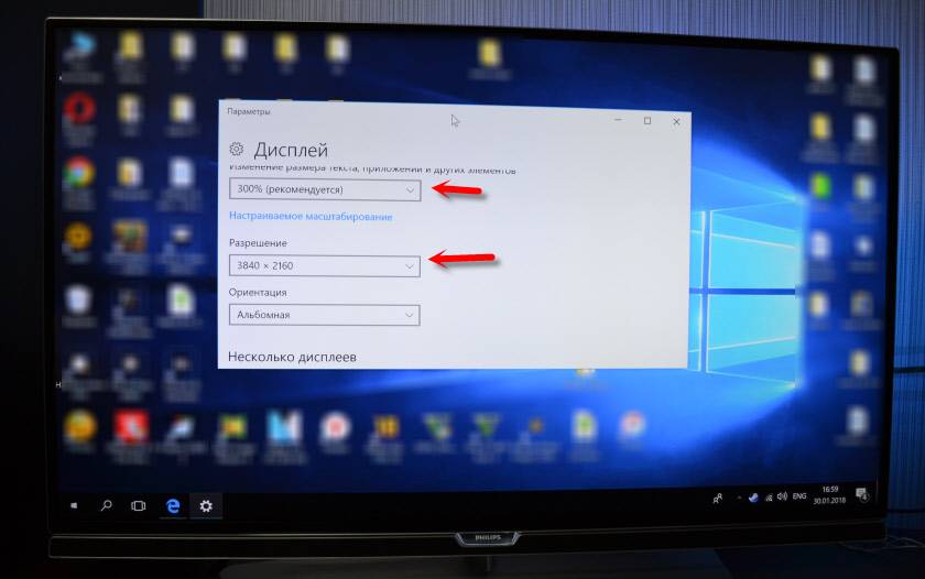 Чтобы получить настоящее 4k изображение с натуральными цветами необходимо просто в свойствах дисплея в Windows 10 сменить разрешение экрана на максимальные 3840×2160.