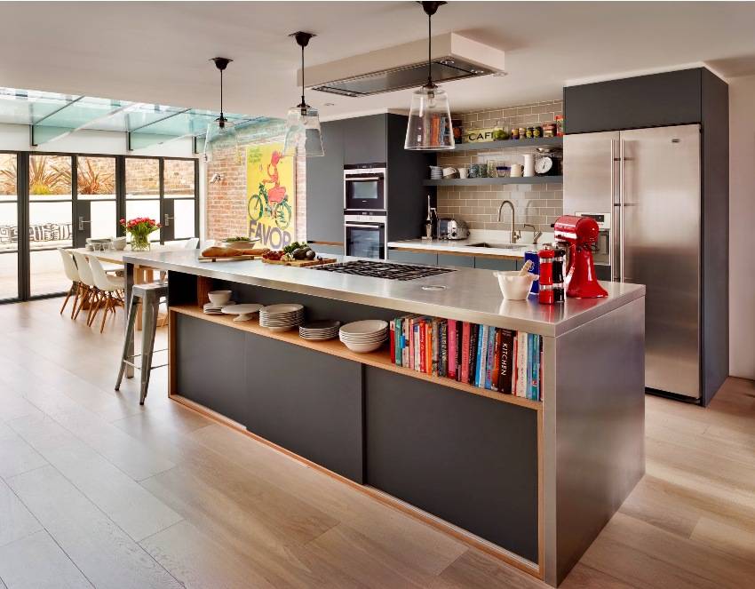 Открытые полки на кухне очень удобны, так как для того, чтобы достать какой-нибудь предмет, не нужно открывать и придерживать дверцу. Здесь можно хранить емкости со специями, столовые приборы в виде лопаток, шумовок, бокалы и предметы декора. Главный недостаток таких полок состоит в том, что они не очень вместительны, а предметы, расположенные на них, требуют постоянного и тщательного ухода.