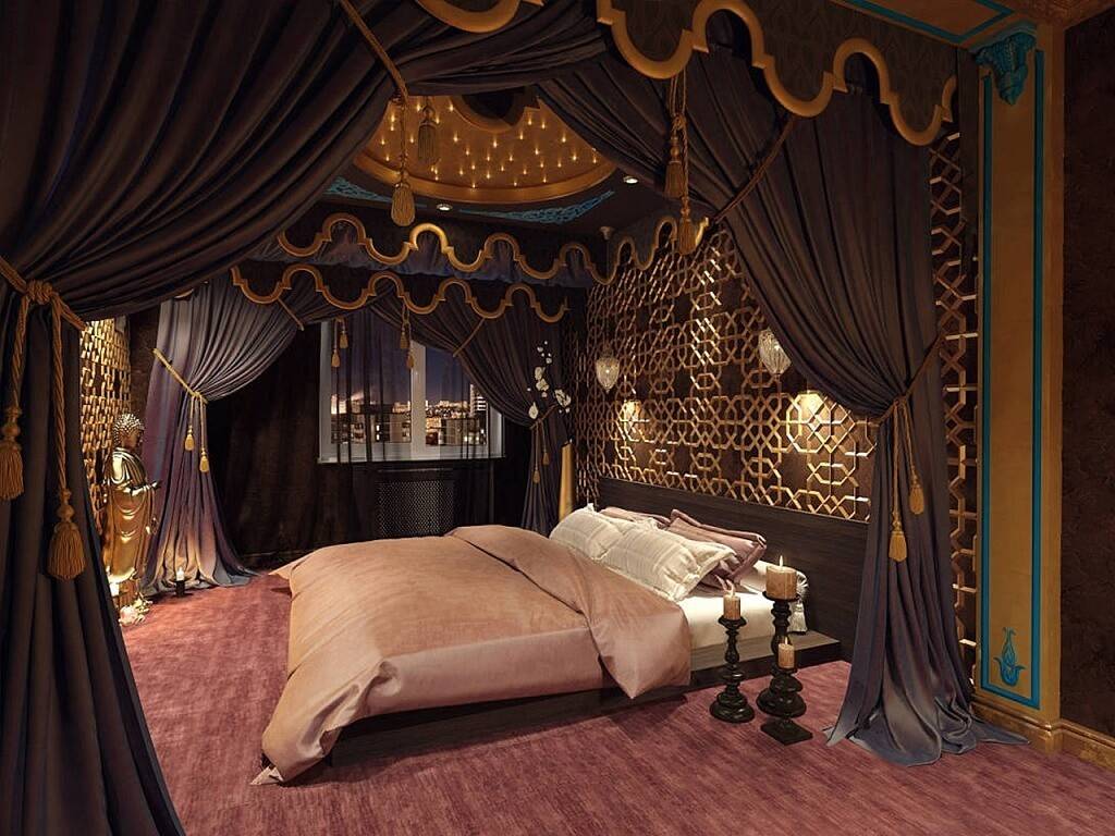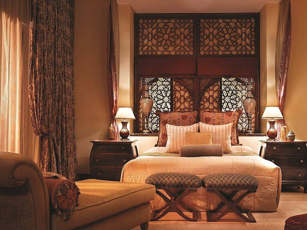 Отлично, если вся мебель для спальни, обыгранной в духе покоев шейха, будет темной и резной. Это придаст интерьеру еще больше роскоши и шика.