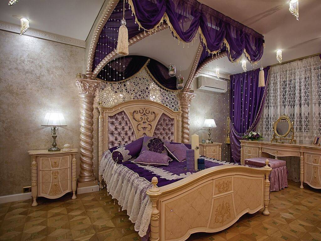 Ключевой элемент мебели – кровать. Она должна быть массивной, большой, просторной, но низкой. Иногда делается подиум, а на него просто укладывается огромный матрас. Над ложем обязательно устанавливается балдахин. Акцентное дополнение – роскошное изголовье. В небольших комнатах предлагается расставить цветовые акценты с помощью колоритных покрывал.