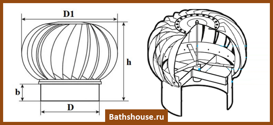 Верхняя часть и нижний цилиндр оснащены кольцевыми отбоями, отклоняющими воздушный поток. В некоторых моделях верхний элемент отсутствует. Тогда на трубу устанавливают нижний цилиндр, дальше идет диффузор и колпаки — прямой и обратный. Работает прибор по простому принципу: