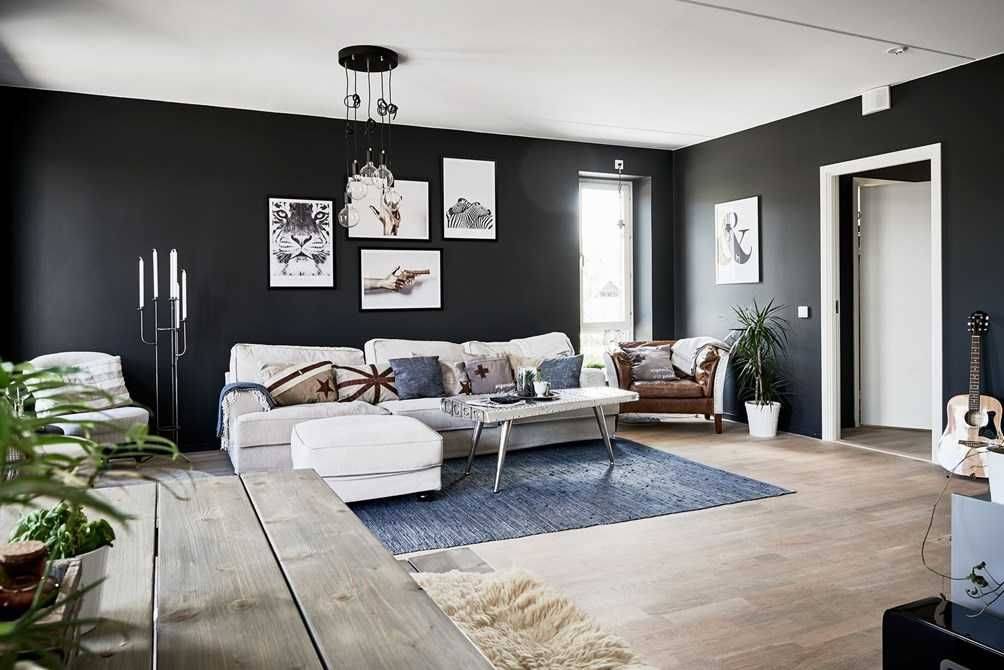 Скандинавский интерьер с чёрными стенами и белым диваном