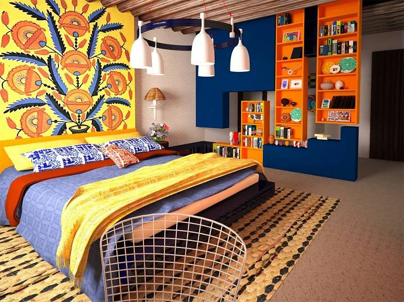 Стены здесь выступают фоном для яркой мебели, а не перетягивают внимание на себя. В спальной комнате хочется расслабиться, поэтому кричащая отделка мало кому придется по душе