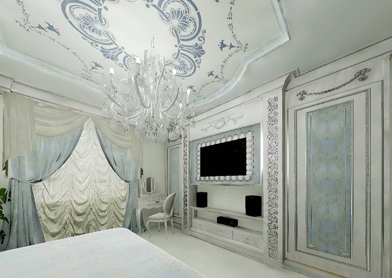 На потолке и стенах может присутствовать лепнина: различные молдинги, колонны, рамки, пилястры. Все эти элементы хорошо смотрятся в просторных помещениях с высоким потолком, как и обилие драпировок на окнах.