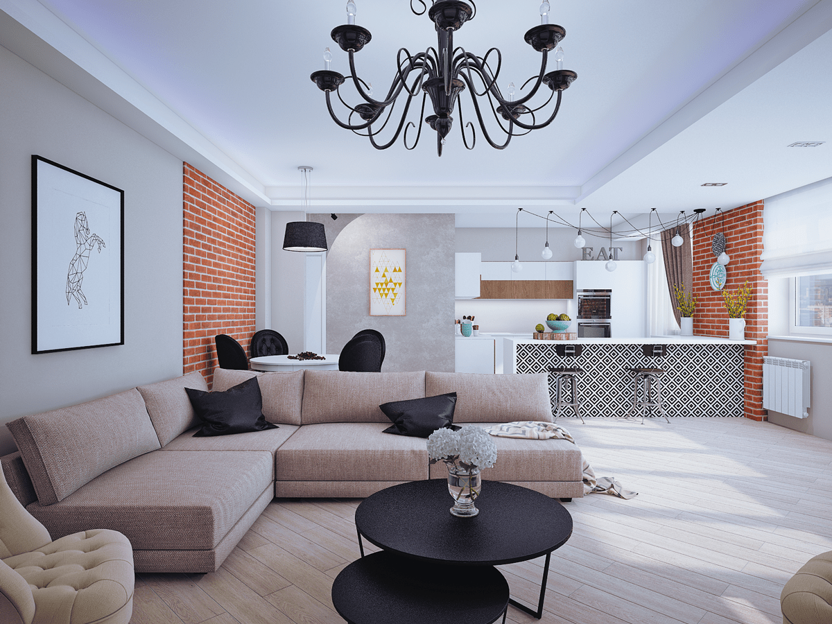 На фото комната в стиле фьюжн с элементами лофта.
