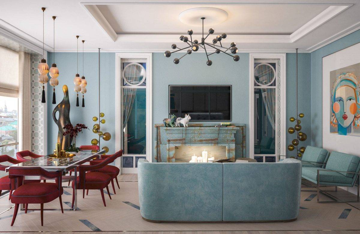 При этом каждый осветительный прибор – люстра, бра, торшер и другие светильники – выглядят как арт-объекты. Они выполняют двойную функцию: электрифицируют помещение и являются декором.