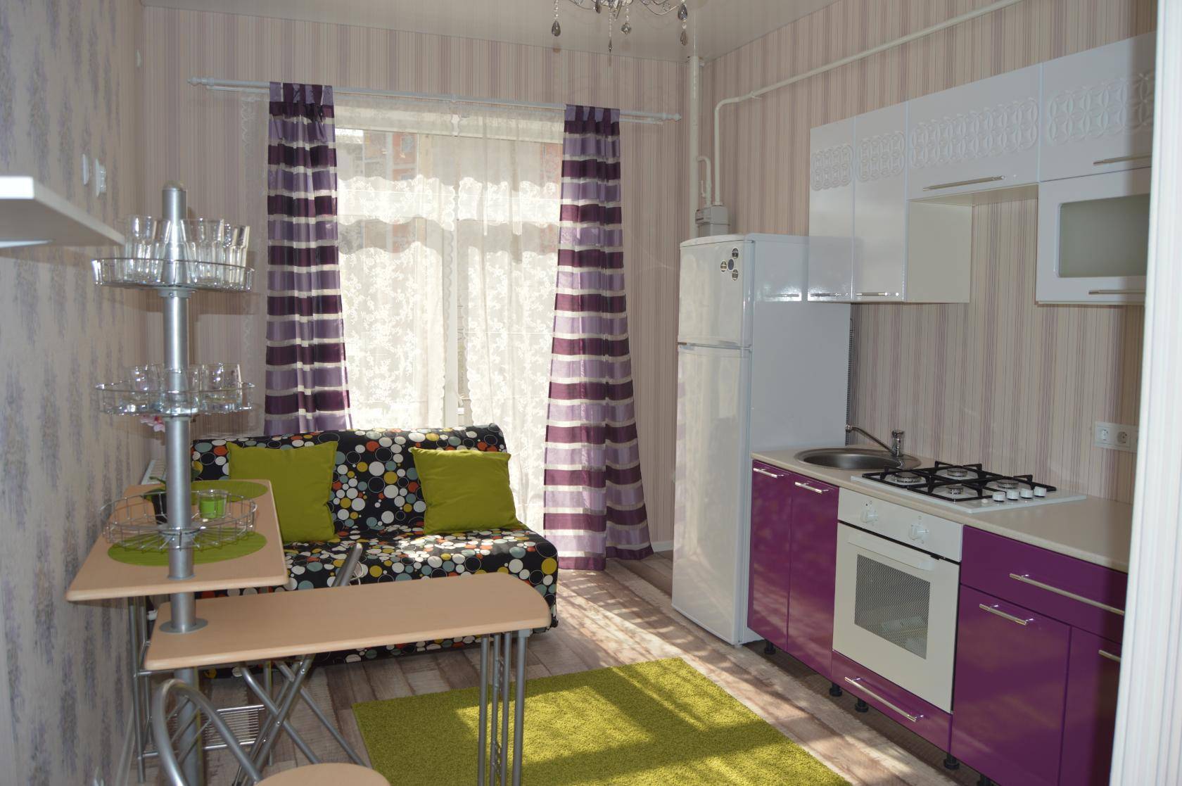 Если хочется больше элегантности, основным стоит сделать нейтральный светлый оттенок. Зеленые и фиолетовые тона можно добавить в яркой отделке фасадов, в легком орнаменте обоев и текстиле.