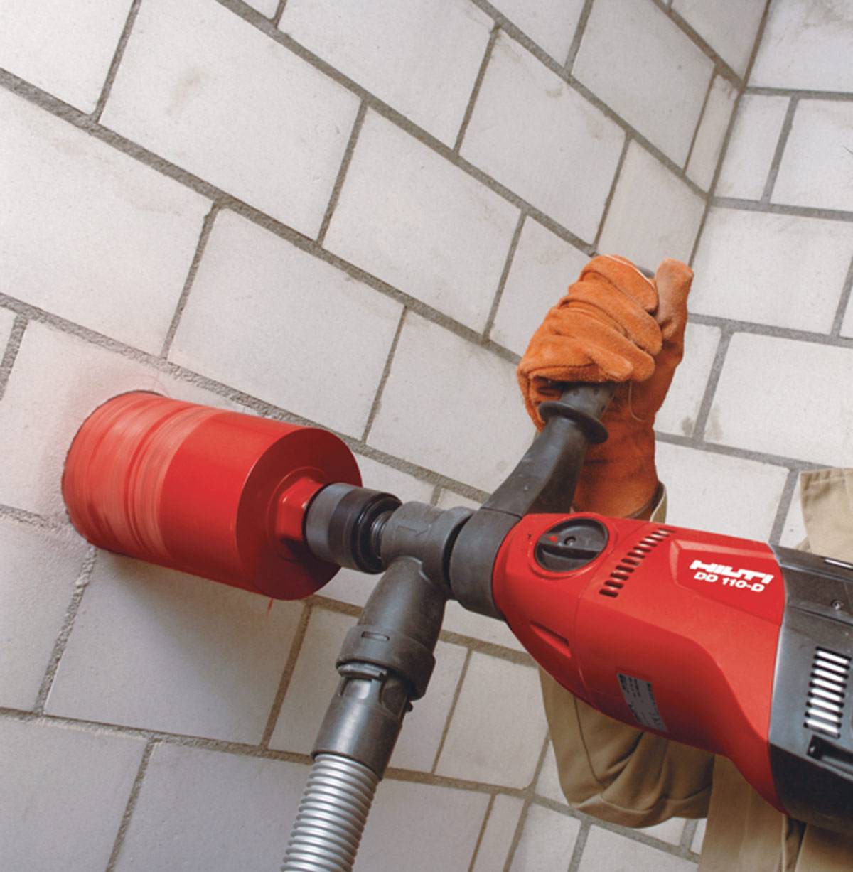 Для любого типа сверления, в том числе и сухого алмазного, используются специальные алмазные коронки, которые позволяют делать сквозные или глухие отверстия любого диаметра. Помимо сухого, допускается функционирование с подачей жидкости, которая применяется для охлаждения. В таком случае прибор будет оснащен системой для подачи жидкости в область, где расположена коронка. Для удаления остатков влаги применяется строительный (промышленный) пылесос. Мокрый тип работ подразумевает отсутствие пыли в помещении. Самыми мощными электроинструментами принято считать приборы, которые оснащены алмазными коронками.