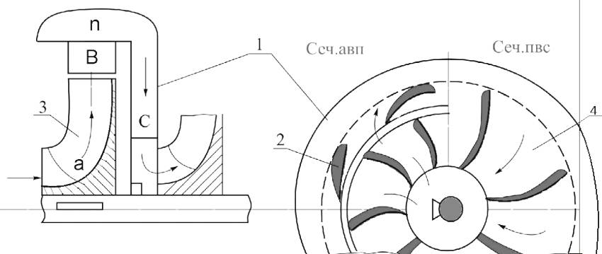 Устройство лопастного насоса: 1 – направляющий аппарат; 2 – лопатки; 3 – рабочее колесо; 4 – межлопаточные каналы