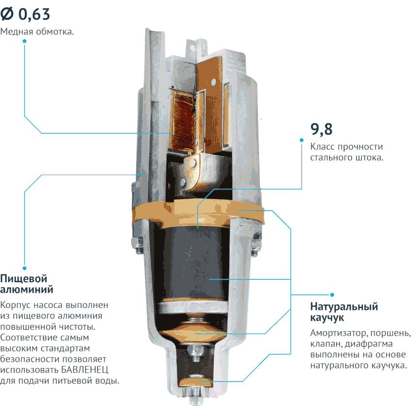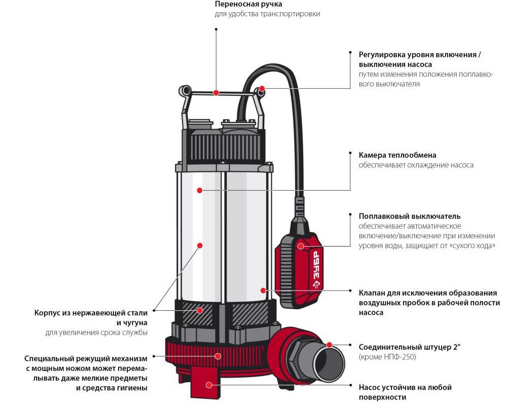 В корпусе погружного насоса установлена герметичная камера с электродвигателем, приводящим в движение рабочее колесо, входной всасывающей камеры, выходного напорного патрубка, системой автоматического отключения питания (поплавковый либо пьезовыключатель).