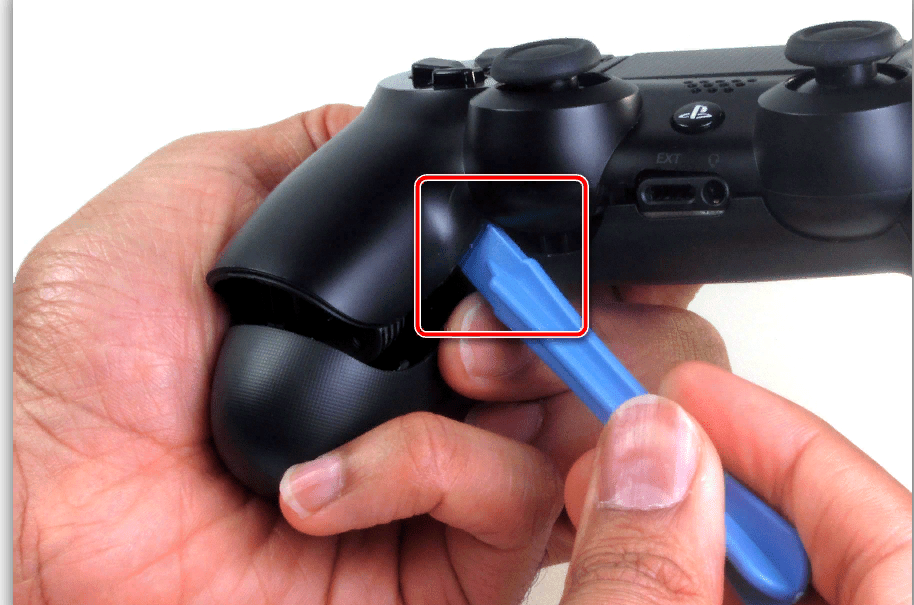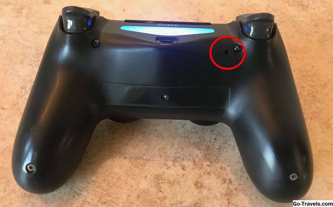 - Переверните контроллер DualShock 4 и найдите небольшое отверстие рядом с левой плечевой кнопкой.