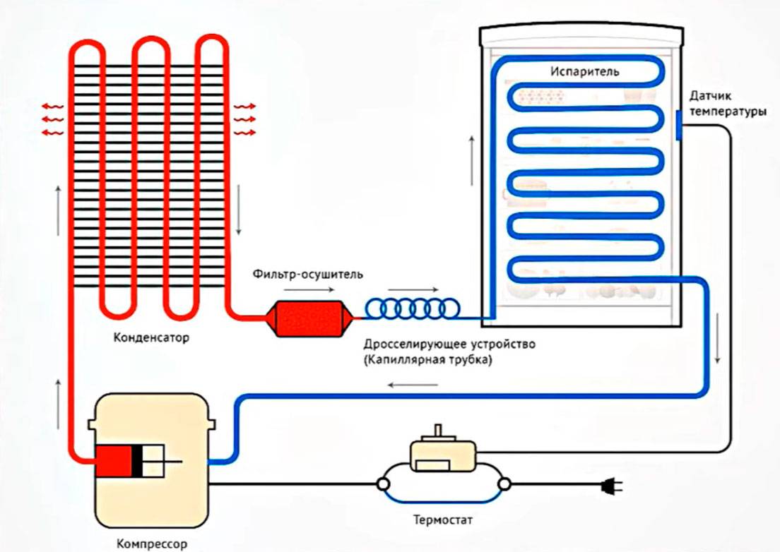 Далее хладагент выводится в фильтр-осушитель, очищается от влаги и проходит по трубкам капиллярной системы, снова попадая в испаритель. После этого компрессор снова начинает перегонку фреона и весь цикл повторяется заново. Когда температура достигнет нужной отметки, реле автоматически отключает двигатель.