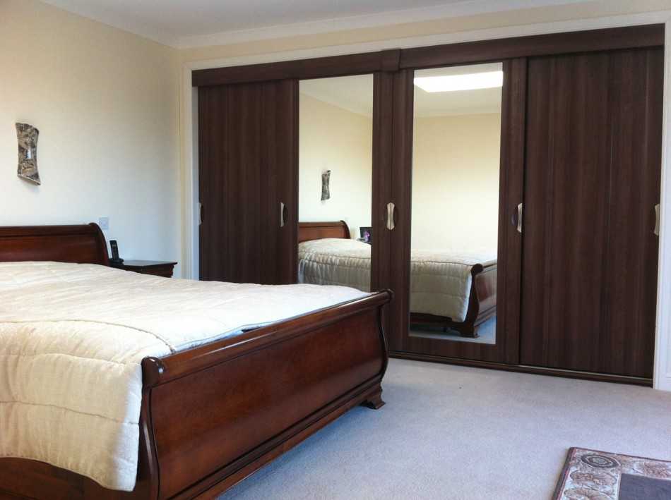 Гардероб совмещенный со спальной комнатой это довольно большая конструкция, массивные дверцы смотрятся тяжеловато и подходят для помещений больших размеров.