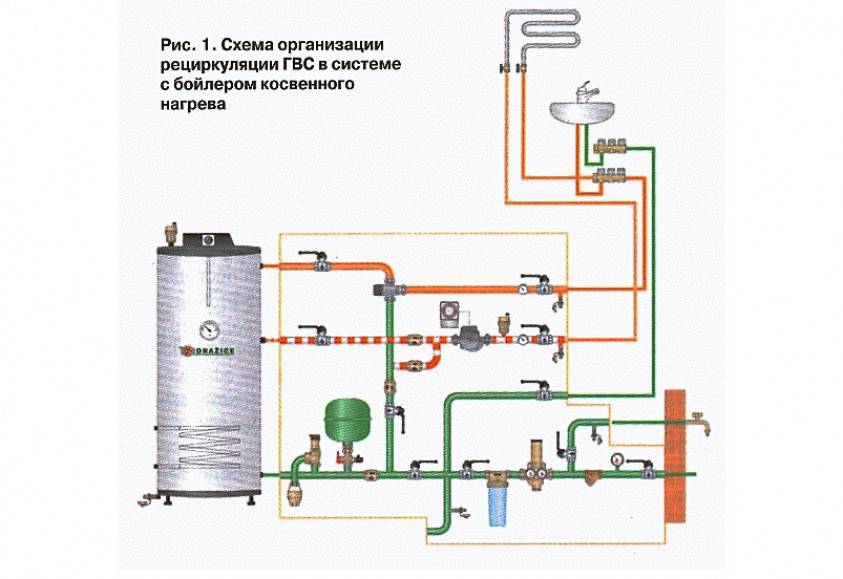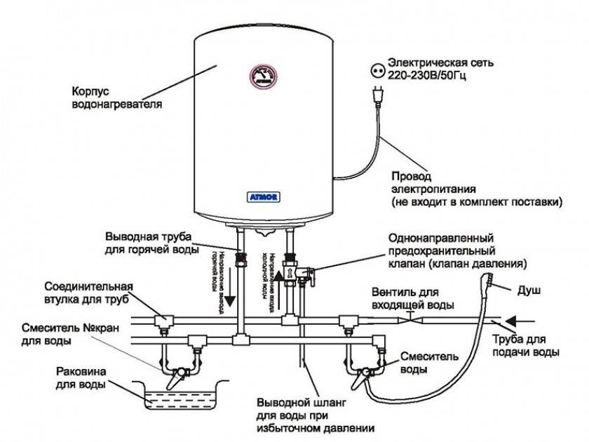 К трубе подачи холодной воды из водопровода подключают расширительный бак и предохранительный клапан, а также устанавливают обратный клапан (на схеме не показаны).