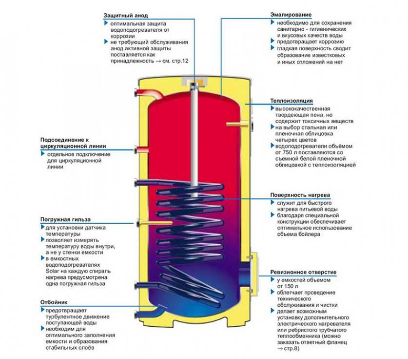 В самом популярном варианте конструкции для прохода теплоносителя используют змеевик, изготовленный из металлической трубы. Змеевик помещают в бак, заполняют ёмкость водой, а затем пропускают теплоноситель.