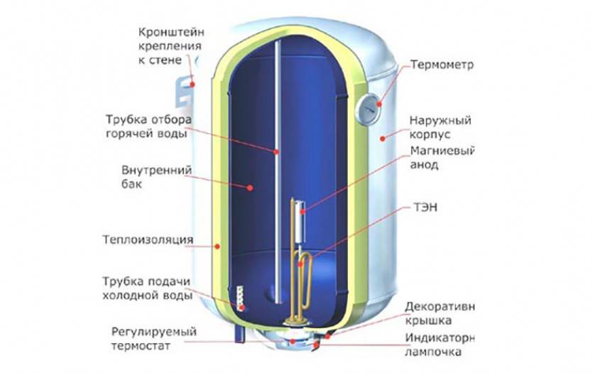 В конструкции нагревателя, устанавливаемого преимущественно в ванной, предусмотрено наличие собственной емкости. Принцип действия прост: бак заполняется водой из водопровода, которую нагревает ТЭН. По достижении установленной температуры нагрева автоматика отключает устройство.