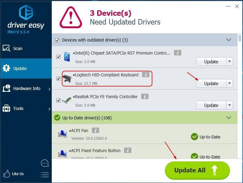 3) Если вы попробуете бесплатную версию, нажмите Обновить рядом с отмеченным драйвером клавиатуры, чтобы автоматически загрузить и установить правильную версию этого драйвера.