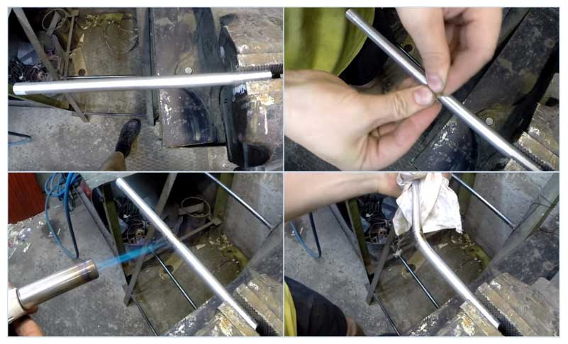 Горячая гибка – возможна практически в любом случае. Ведь в разогретом состоянии пластичность любого материала повышается на порядок. Например, высокотемпературная гибка стальных труб (или изделий из любого другого металла) осуществляется очень просто: трубу просто нагревают в месте деформации и сгибают руками. То есть станки или механические трубогибы, в этом случае, нам уже не понадобятся.