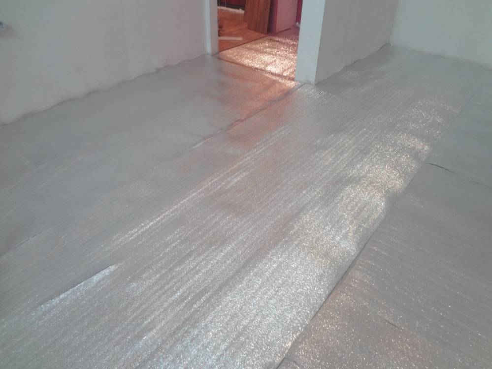- На пол укладывают подготовленные полосы материала с нахлестом 100-150 мм.