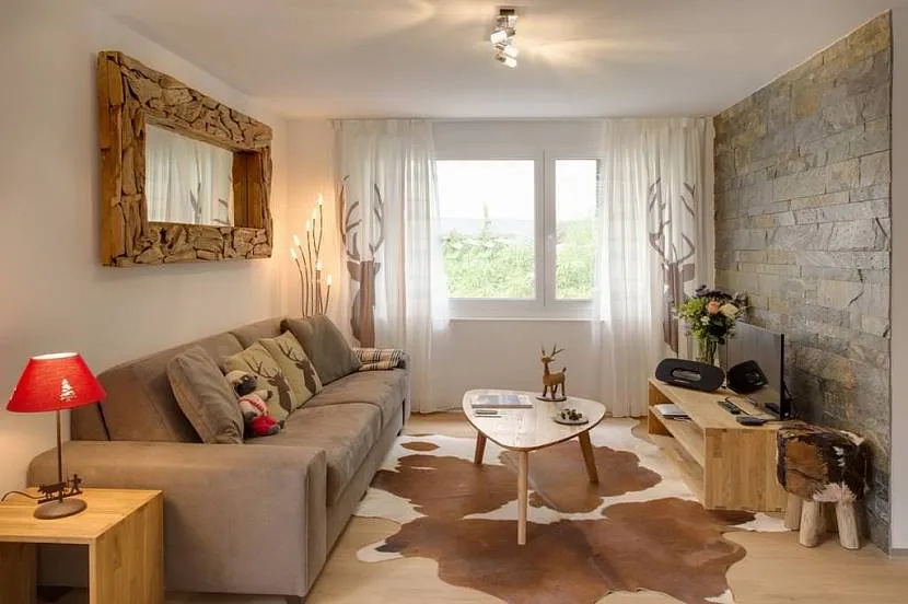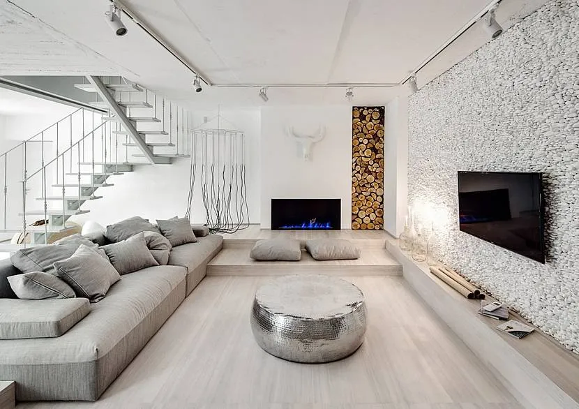 Используйте любой натуральный материал для отделки стен гостиной: дерево, декоративный камень, бамбуковые панели или даже ракушки. Также подходят фотообои и 3D панели с изображениями пейзажей или имитацией природных текстур: снега, утренней росы, песка.