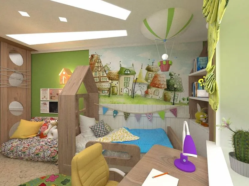 Пространство детской в экостиле должно иметь свободное пространство для игр и учёбы. Интерьер исполняется с помощью приятных природных оттенков, принтов с животными или представителями растительного мира.