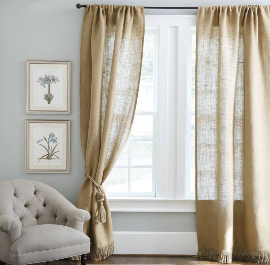 Для гостиной в экостиле подойдут простые льняные натуральные шторы