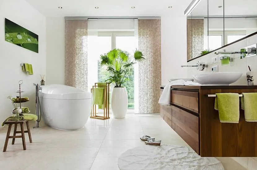 Вариантов отделки пола и стен множество. Широкий выбор керамогранита позволяет воссоздать практически любые изображения, вплоть до фотопечати по эскизу заказчика. Эко стиль в интерьере ванной может быть выполнен в нейтральных тонах, без присутствия картинных пейзажей или декоративных приёмов. Подчеркнуть принадлежность к природному балансу можно и другим способом. Рассмотрите вариант установки столешницы из натурального камня или сантехнического оборудования (ванная, раковина) из натурального дерева. Произведённый эффект будет потрясающим.