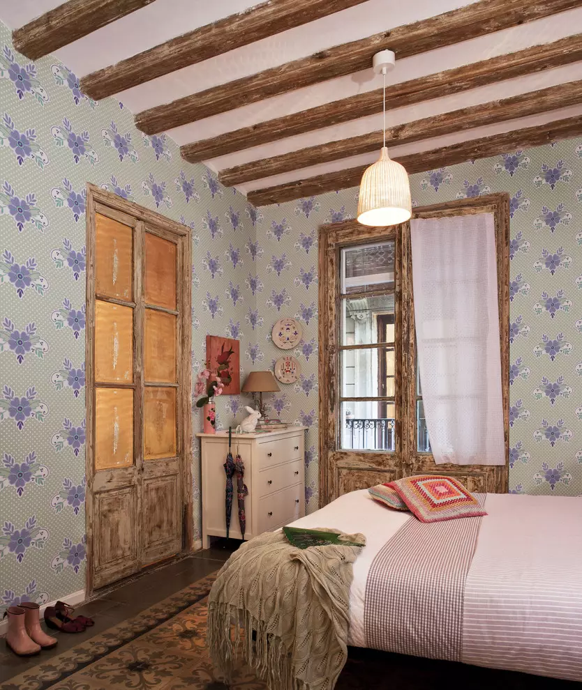Оклейте стены нейтральными бумажными обоями с цветочным узором или покройте водоэмульсионной краской, чтобы потом украсить их живописными полотнами. На пол постелите легкий ковер из натурального волокна, потолок можно просто побелить или оформить декоративными балками. Полупрозрачные шторы используйте для оформления оконных проемов, а лаконичной формы деревянную кровать (можно с коваными элементами) застелите шерстяным покрывалом.