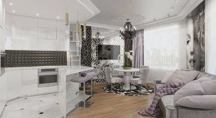 Современная гостиная в стиле арт-деко, совмещенная с кухней
