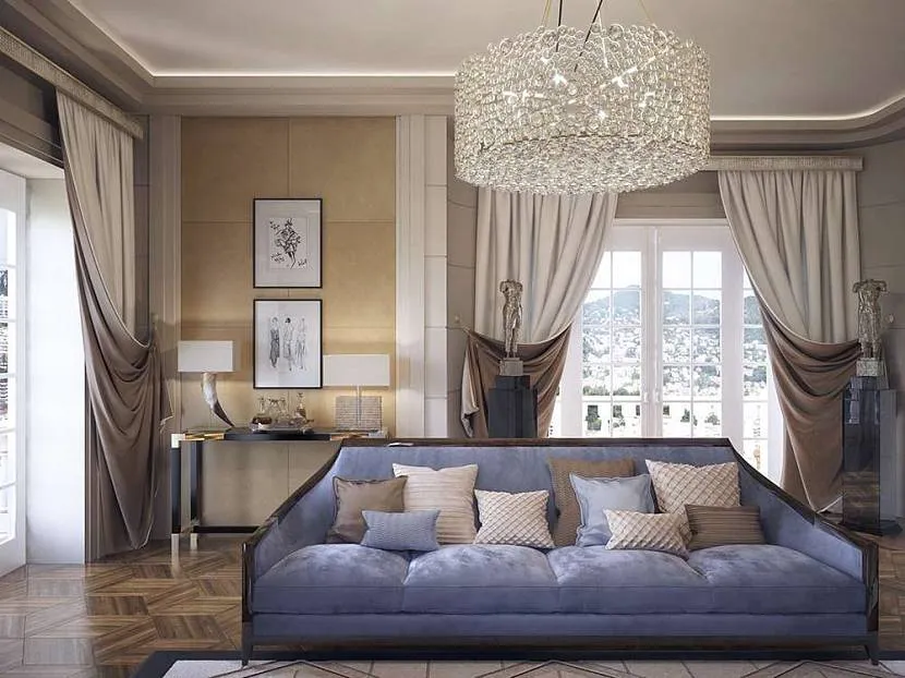 Очень большие по площади помещения освещают двумя хрустальными потолочными люстрами. Они успешно вписываются в светлый интерьер (бежевый, кремовый, реже кофейный), обязательно дополняются шикарной лепниной. На организацию такого потолка уходит уйма времени, но результат превосходит все ожидания.