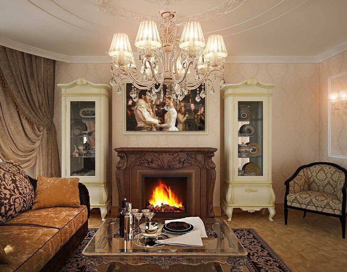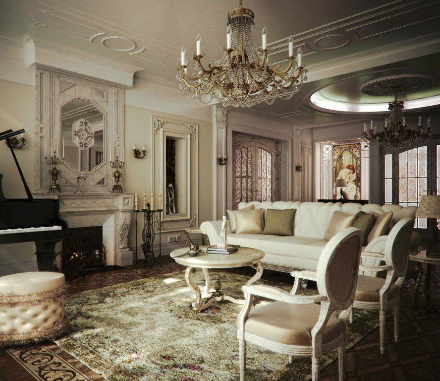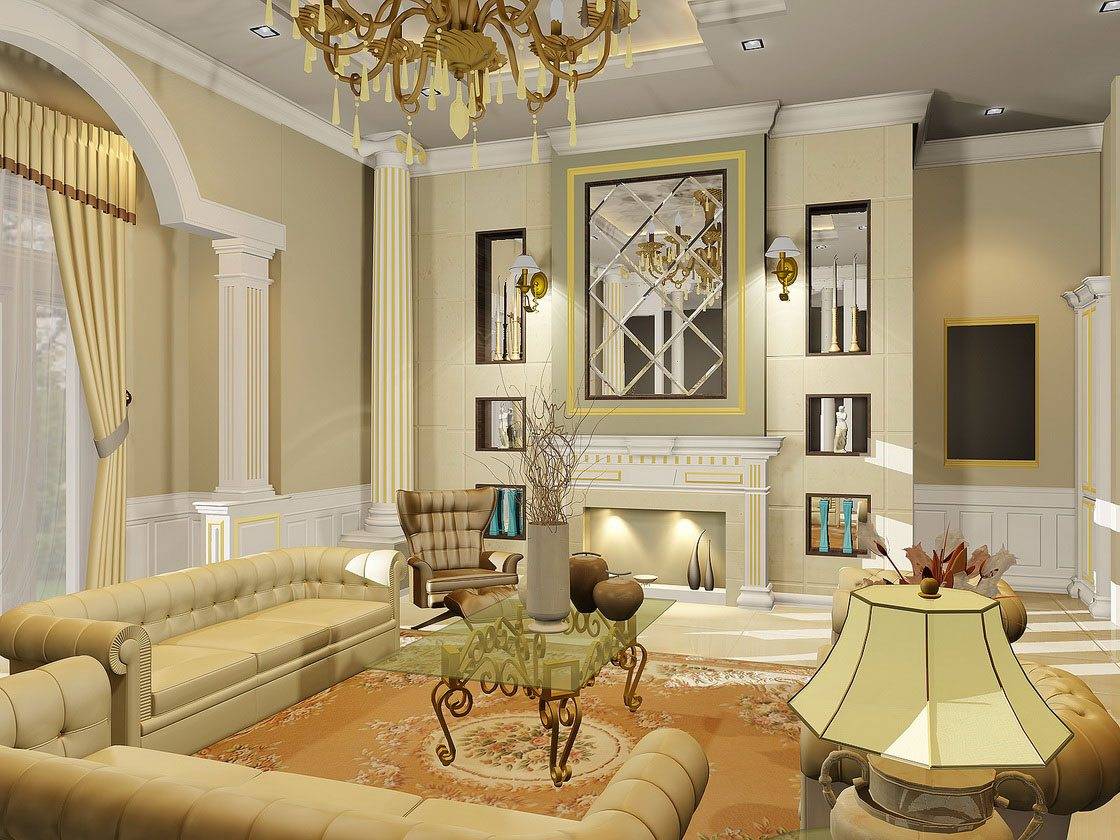 Классический дизайн гостиной нельзя представить без натурального богатого текстиля, который придает благородную и изысканную атмосферу помещению. В качестве декоративных элементов в интерьер органично вписываются старинные аксессуары, элементы ручной работы, антикварные изделия, серебряные подсвечники, картины, зеркала в изящном обрамлении, гипсовые скульптуры.