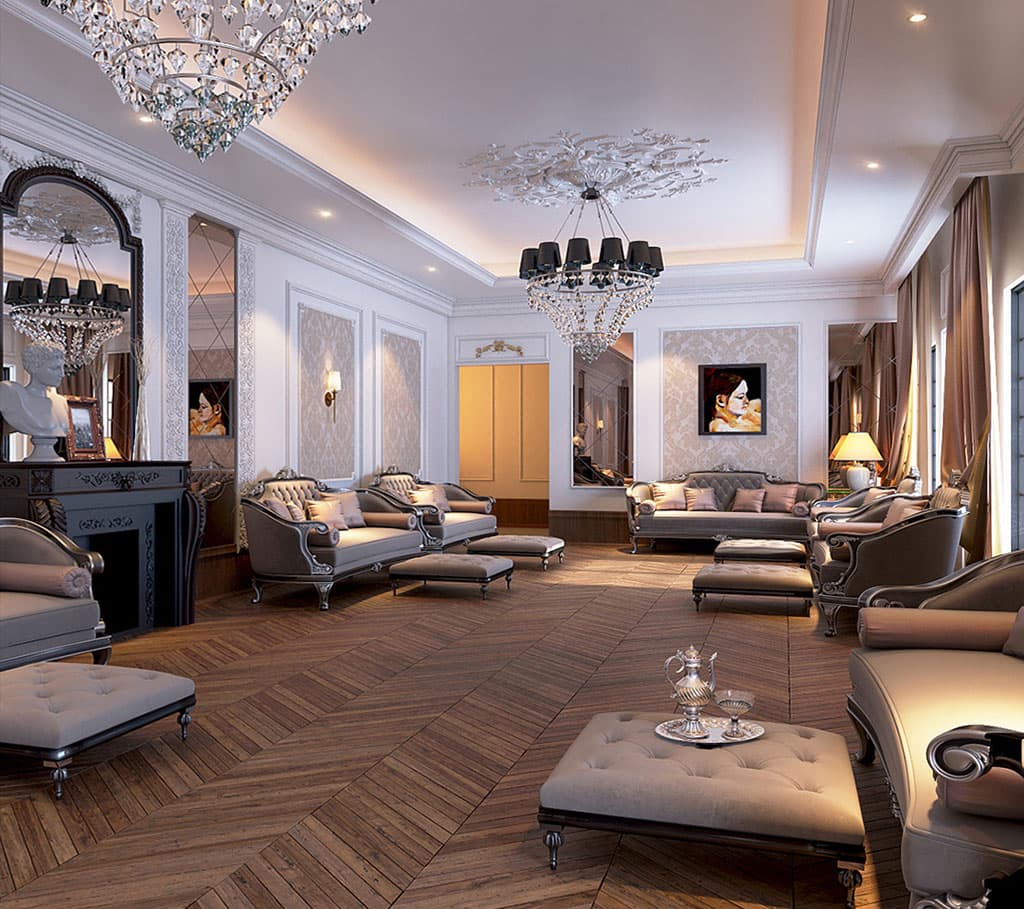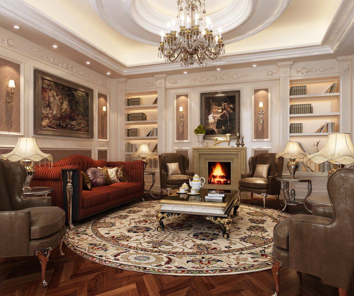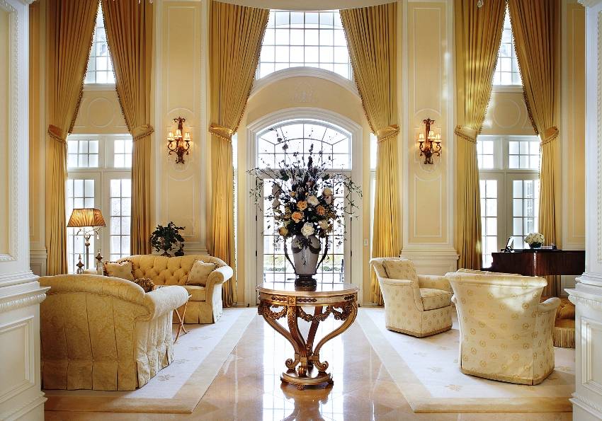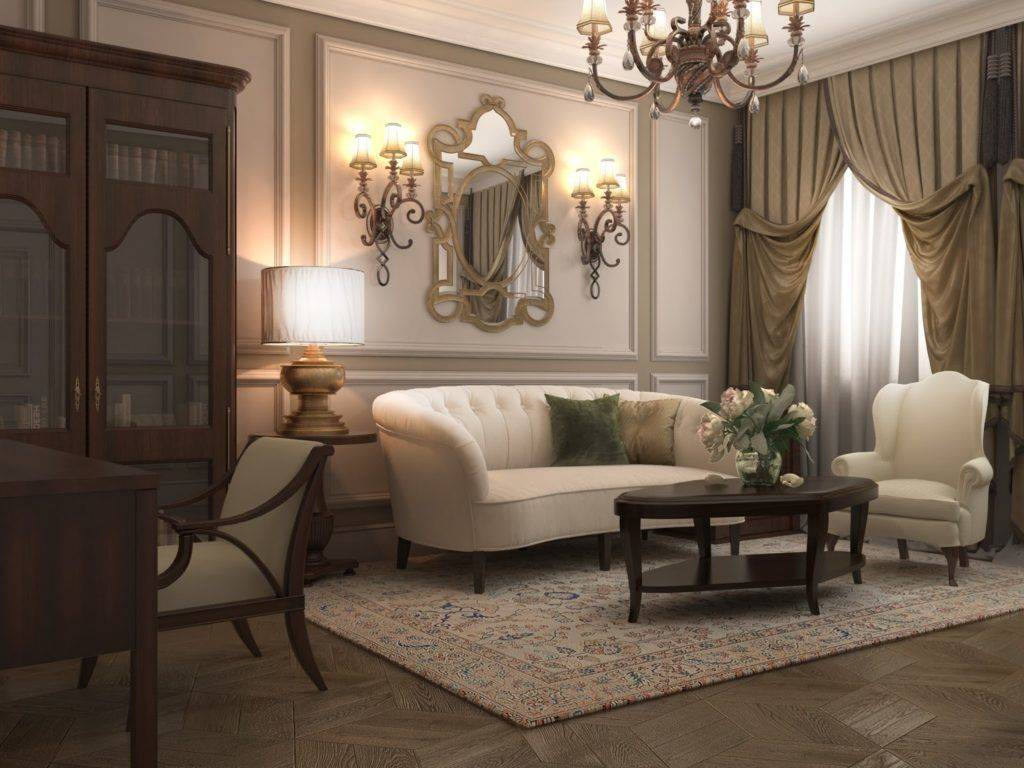 Помещение в классическом стиле оформляется натуральными материалами в виде дерева, камня и металла. Мебель должна быть добротной, массивной, украшенной декоративной резьбой, лепниной и позолоченными вставками. Общую обстановку дополняют элементы интерьера сферической и полусферической формы. Это могут быть арки, колонны и верхние части окон. Помещение должно наполняться светом, который не только поступает через окна, но и возникает благодаря многочисленным осветительным приборам, расположенным по всей его площади.