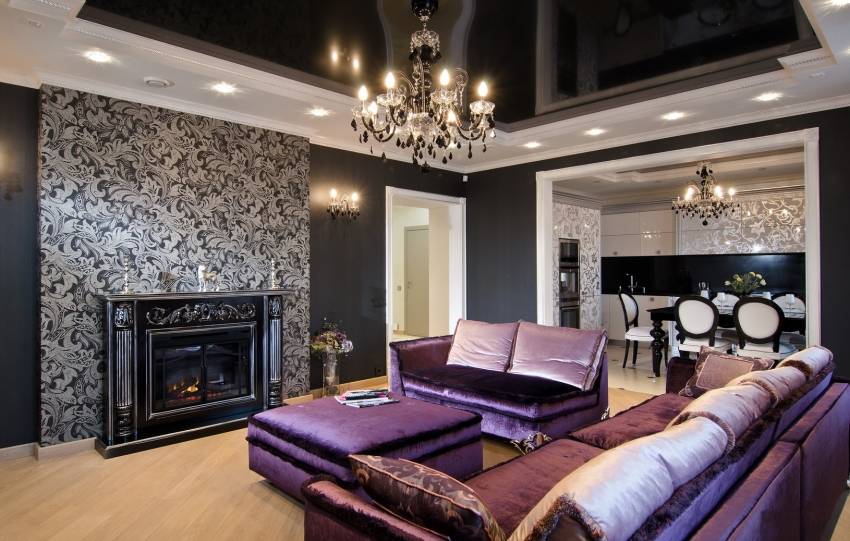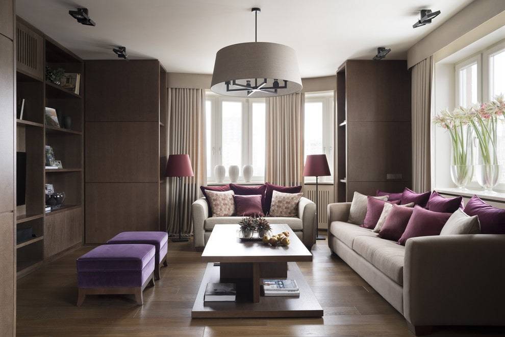 Яркие акценты пурпурного цвета в классической гостиной