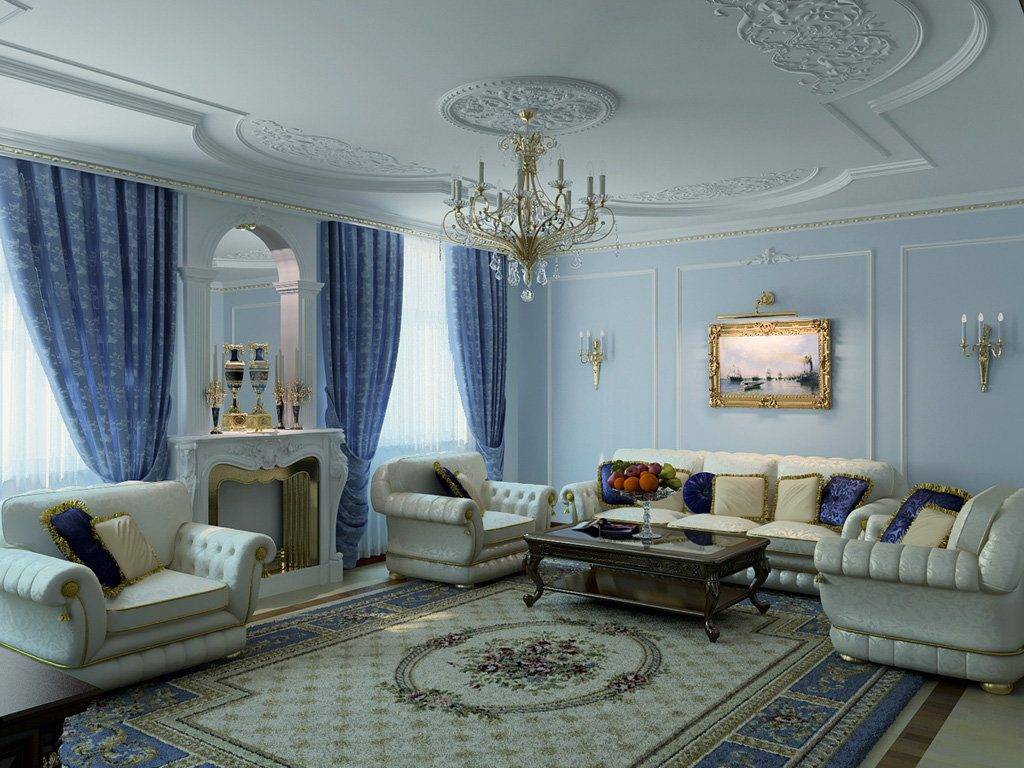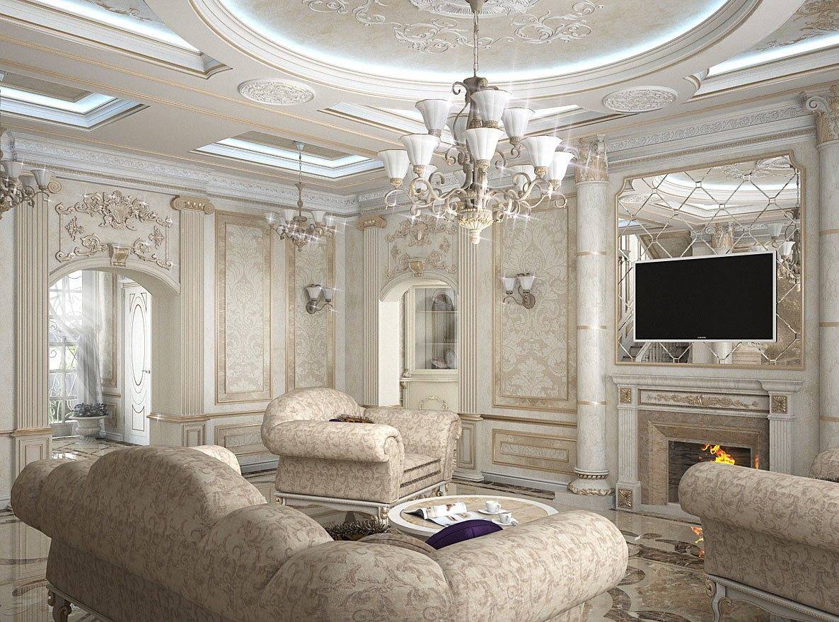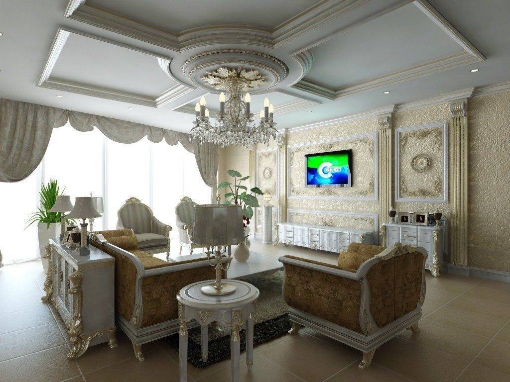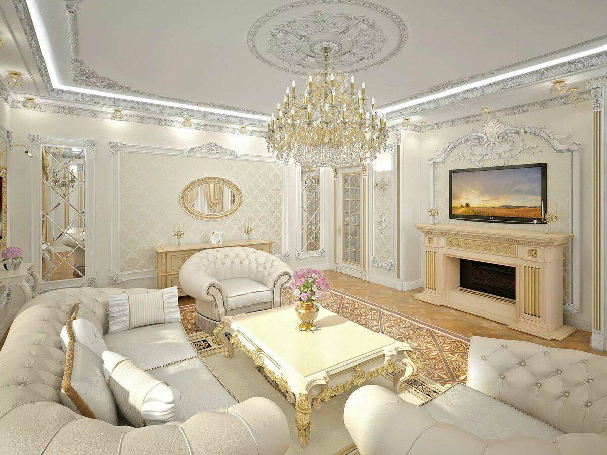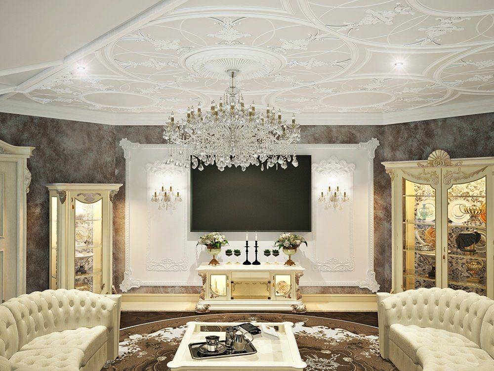 Лепнина всегда считалась необходимой частью гостиной в традиционной классике, и современные требования сохраняют данный элемент, но значительно сократив его. Лепнина используется на потолке, присутствует в потолочных розетках и кессонных потолках.