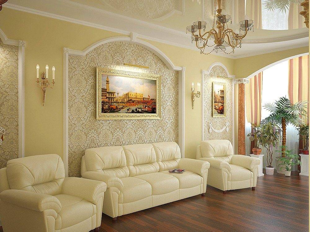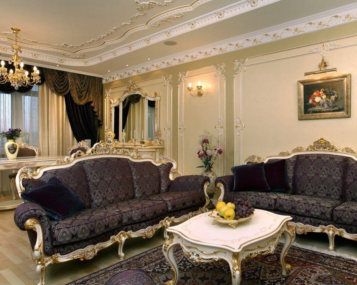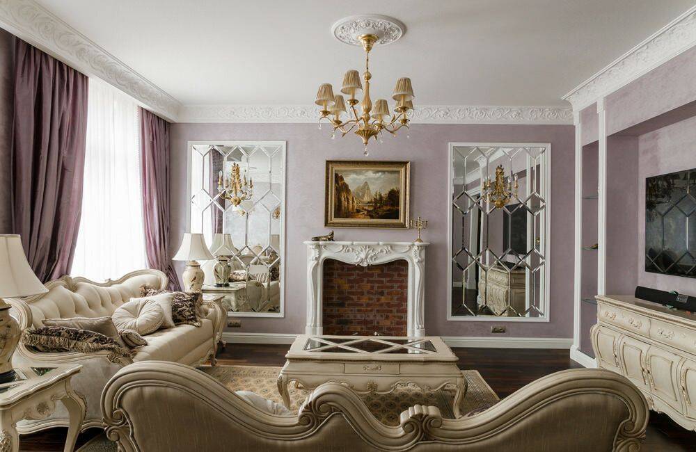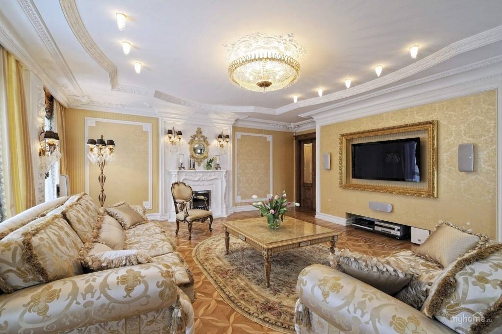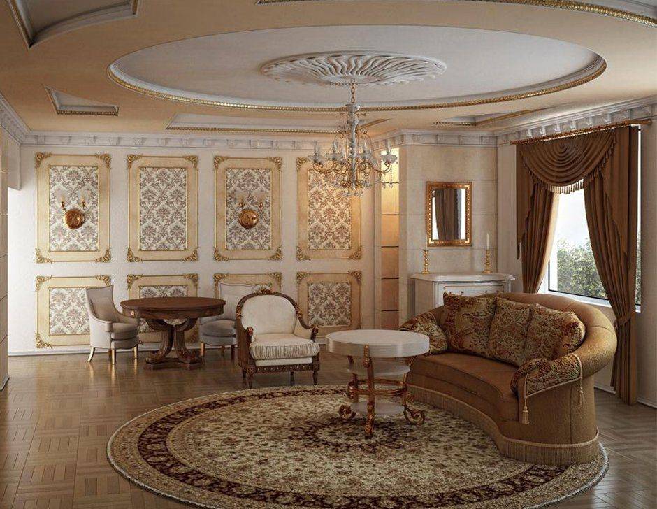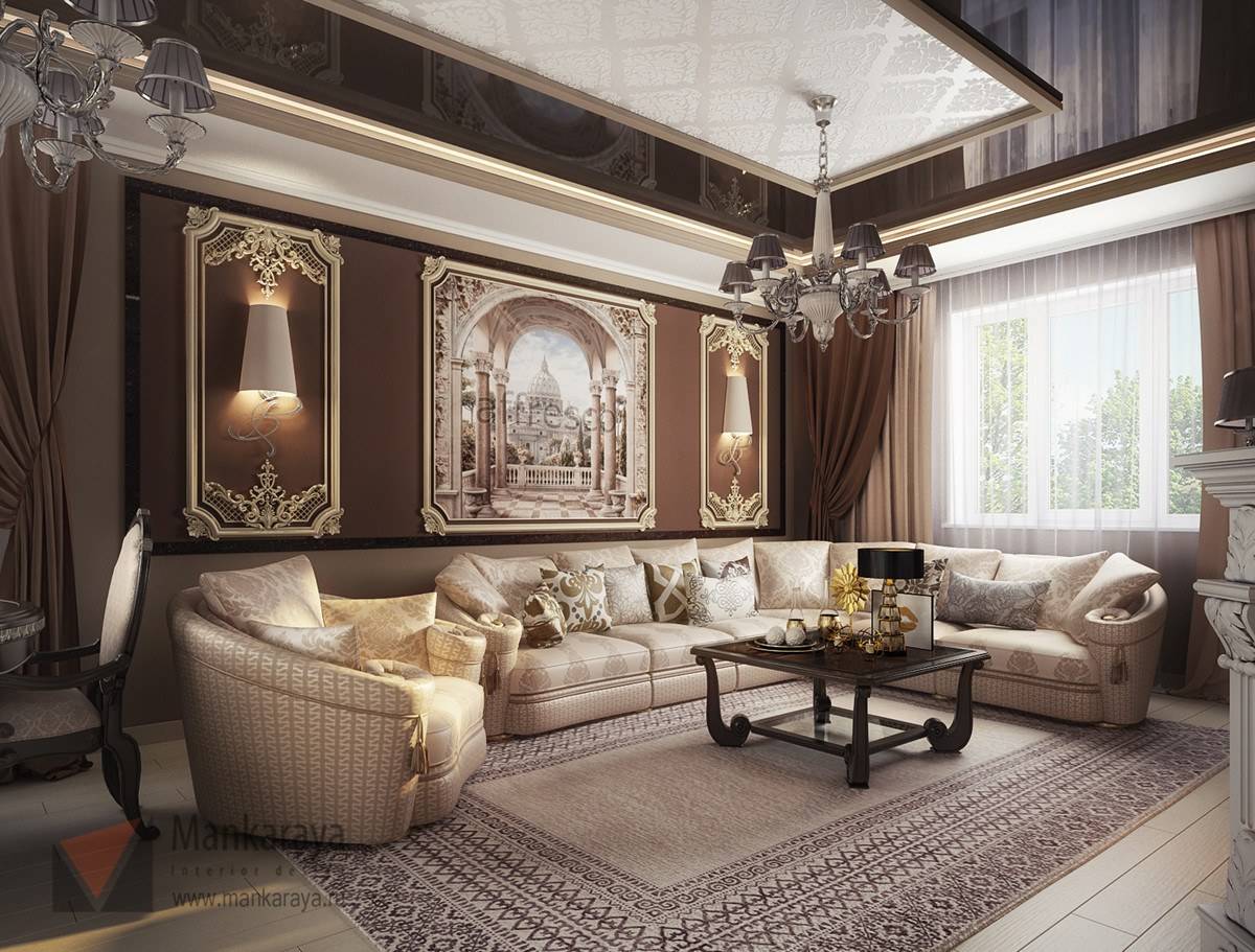 Лепнина всегда считалась необходимой частью гостиной в традиционной классике, и современные требования сохраняют данный элемент, но значительно сократив его. Лепнина используется на потолке, присутствует в потолочных розетках и кессонных потолках.