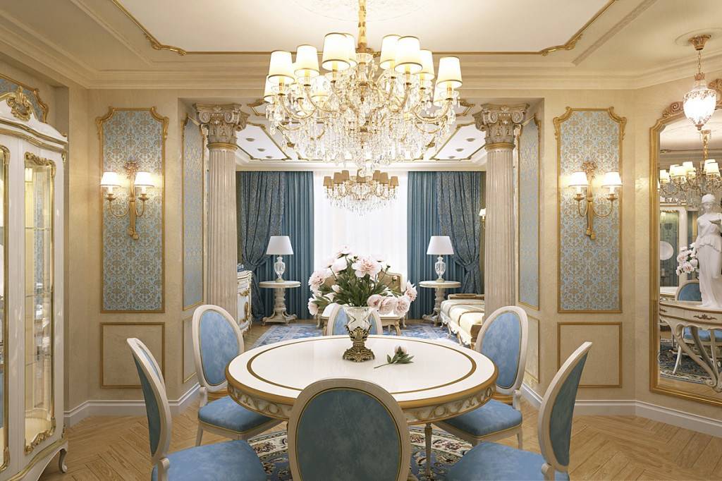 Яркие элементы классики. Получив от классики все самое лучшее, неоклассика содержит арки, античные колонны, пилястры, хрустальные светильники, молдинги, подсвечники, статуэтки и зеркала в узорчатых рамках. Особенным украшением служит лепнина, завораживающая и приковывающая к себе взгляд даже равнодушного к стилю. Но, имеющим возможность получить всю эту роскошь, следует не перенасытить пространство декоративными деталями, в противном случае они будут неуместны.