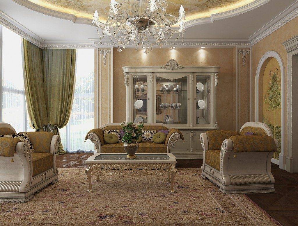 Вся обстановка гостиной в классическом стиле должна состоять из добротных, качественных материалов и предметов мебели