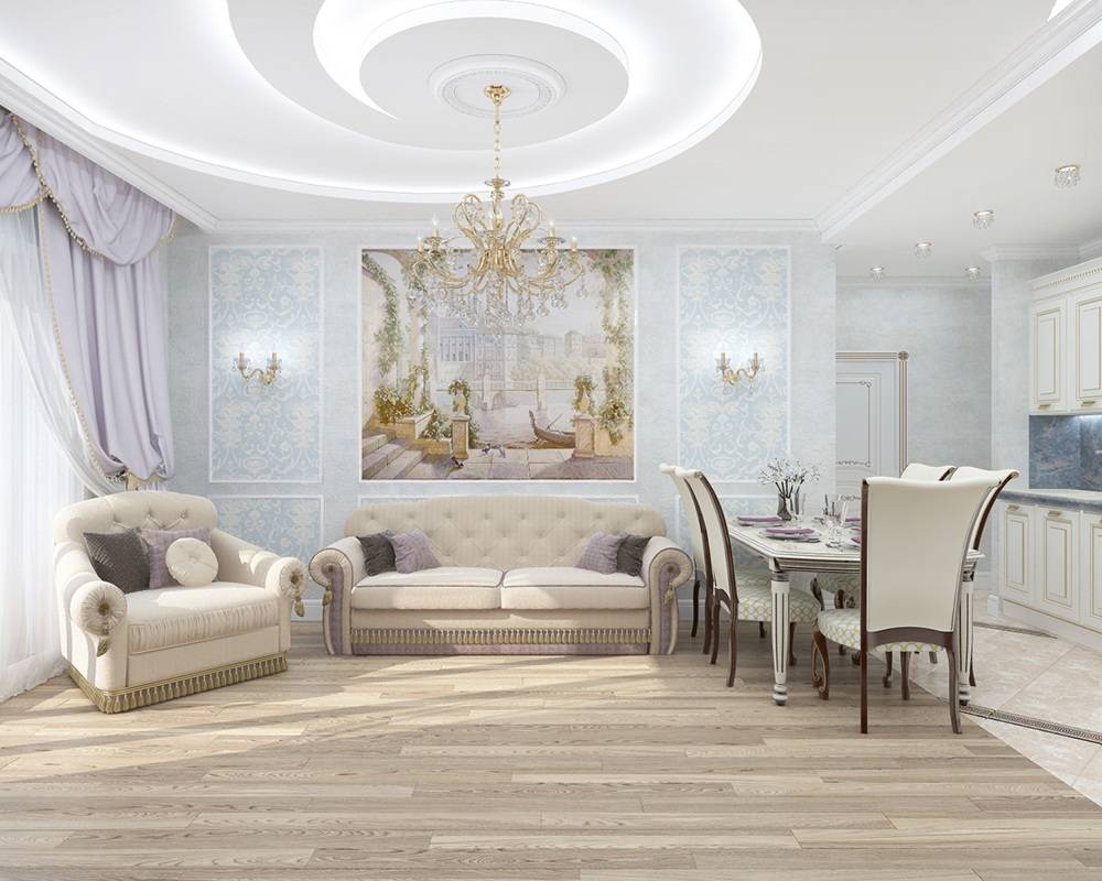 Гостиная в классическом стиле в пастельных тонах