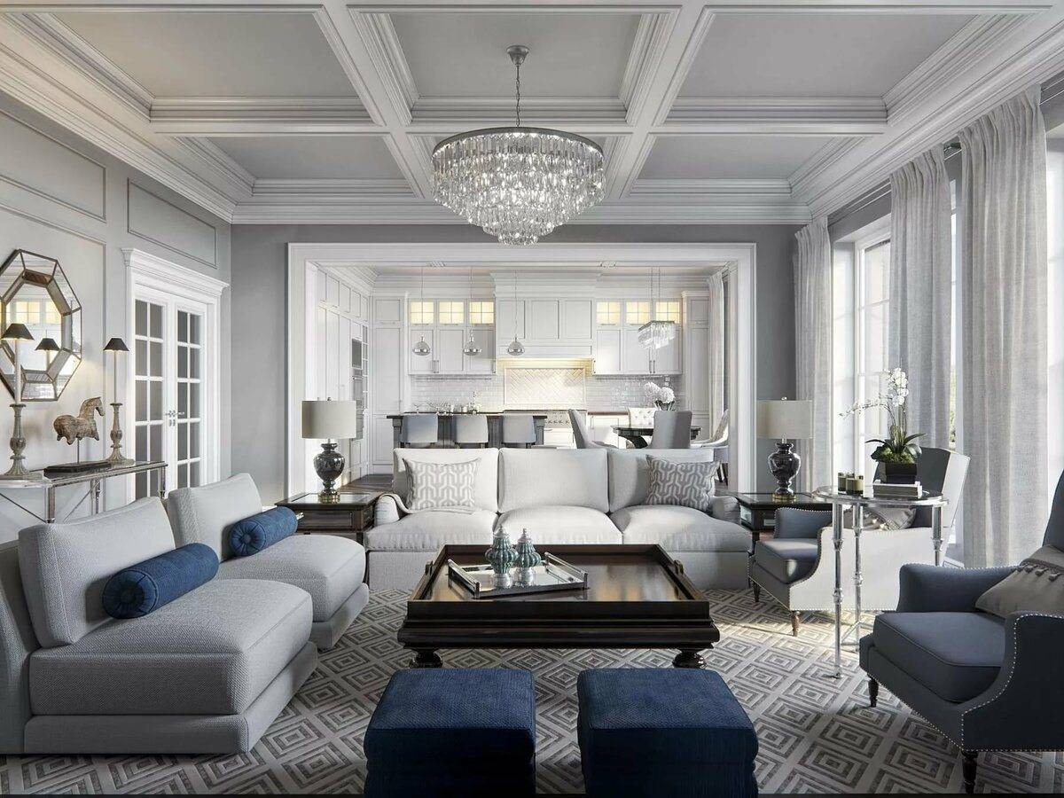Гостиная в современном классическом стиле может быть окрашена в такие оттенки, как: