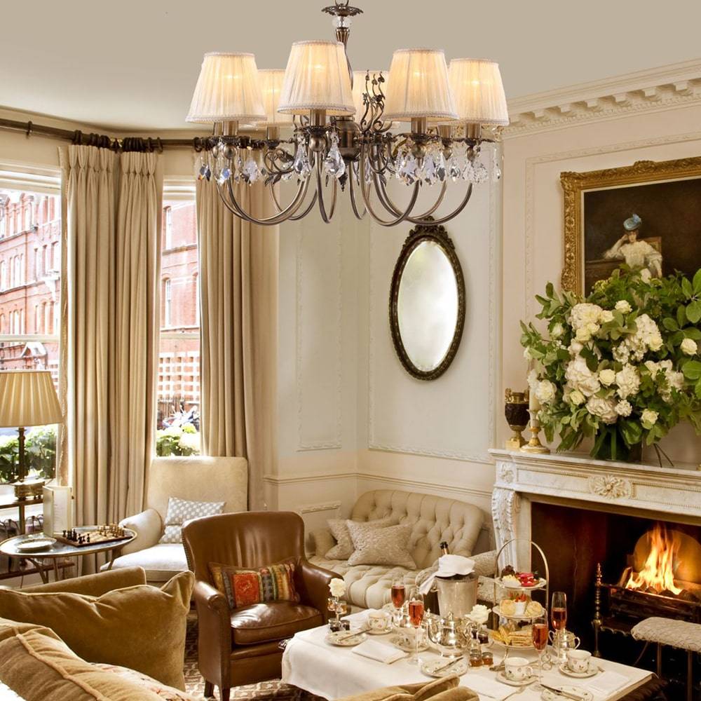 Для гостиной в современном классическом стиле не рекомендуется экономить на освещении. В центре зала обычно помещается хрустальная люстра с подвесками.