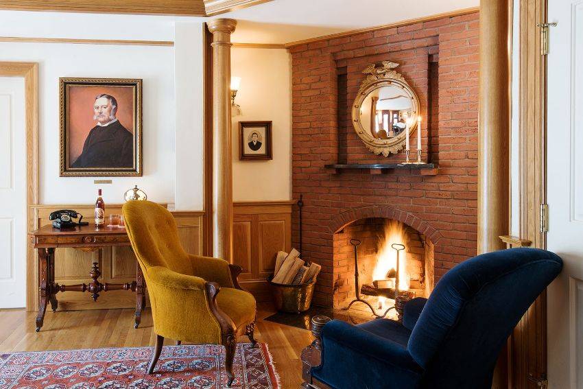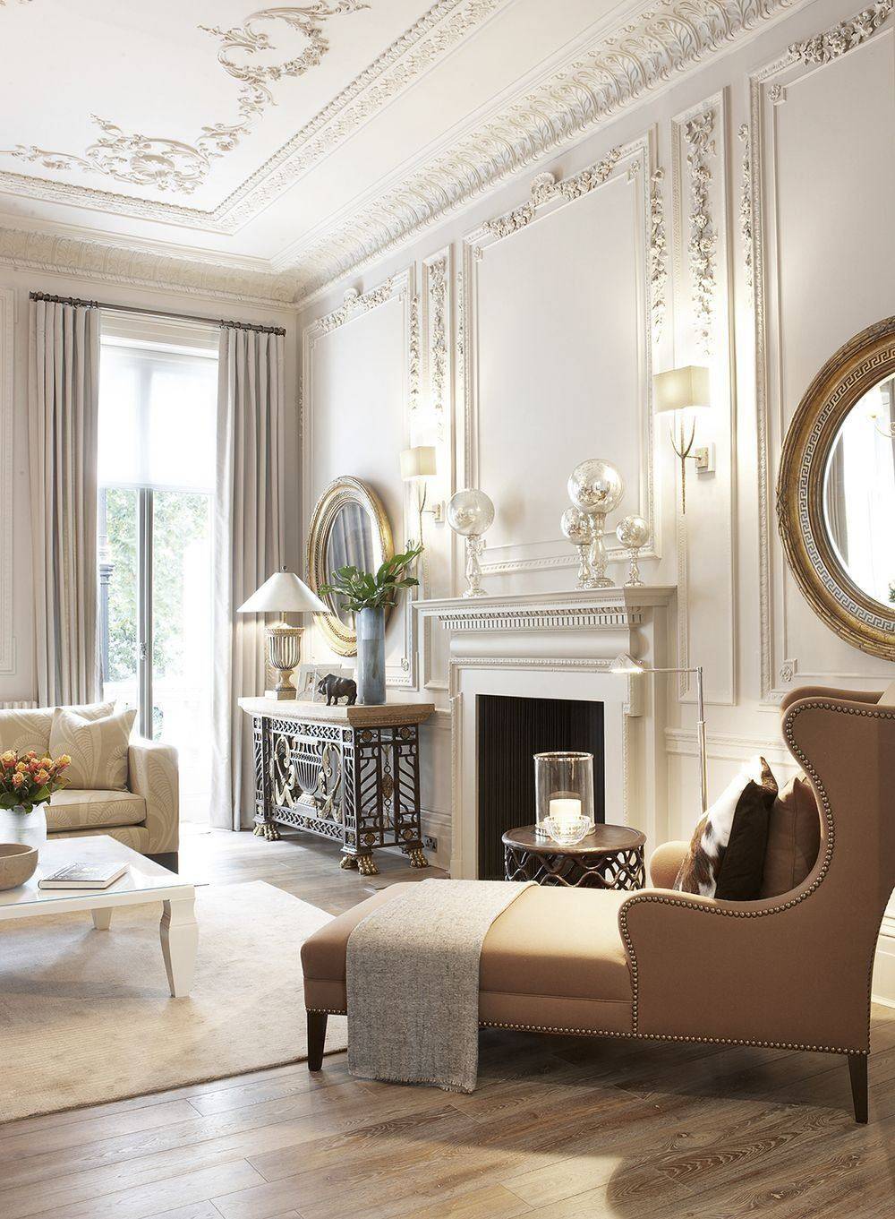 Симметрия. Это традиционный классический прием расположения мебели. Множество парных элементов, таких как светильники, кресла, кувшины, располагаются, обрамляя камин – центральную часть всего помещения.