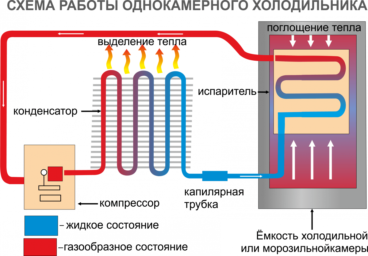 Накопленное техникой во время работы тепло рассеивается в комнате — для этого на задней стене холодильника предусмотрен теплообменник. Принципиально, что характеристики и характеристики хладагента подбираются исходя из определенной температуры помещения, которая в обычных критериях всегда выше нулевой отметки. Понятно, что бытовые холодильники заправляются таковой жидкостью, которая рассчитана на эксплуатацию в плюсовом температурном диапазоне, другими словами в отапливаемом помещении.