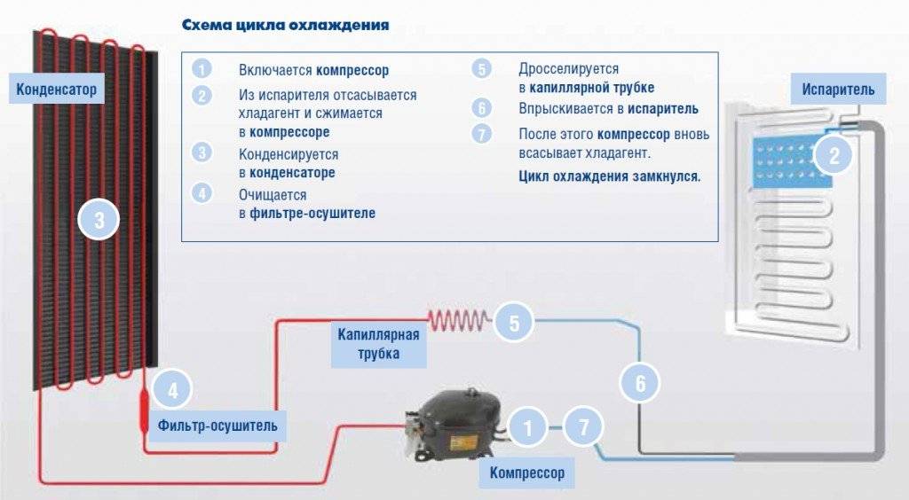 - Этот цикл многократно повторяется, за счет чего и происходит образование холода в морозильной камере.