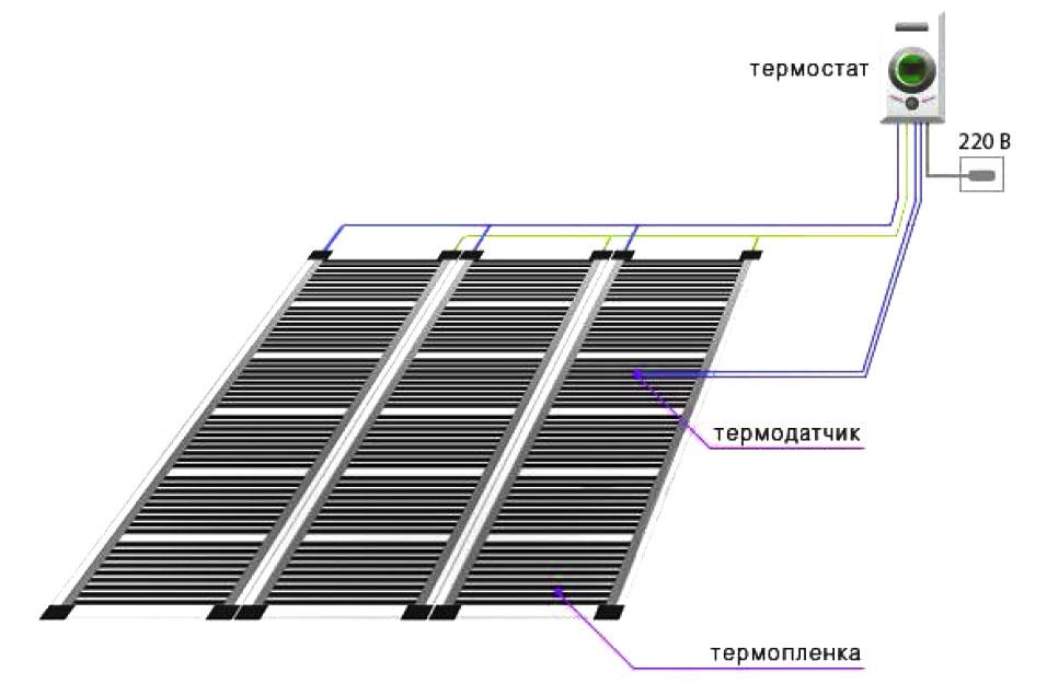 Стоит помнить, что для подключения к терморегулятору нескольких комплектов теплых пленочных полов одного кабеля будет мало. Потребуется приобрести дополнительный провод для присоединения терморегулятора к сети питания.