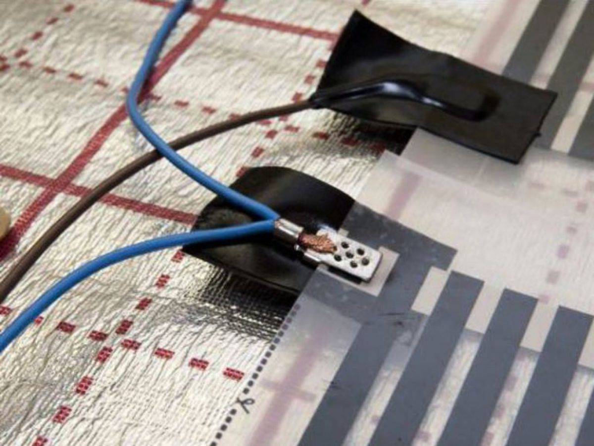 - подключение и обеспечение изоляции в соответствии с ПУЭ и инструкцией от фирмы-изготовителя. Для этого контактные зажимы фиксируются с медной шиной в местах будущего подключения проводов плоскогубцами. Причем одна сторона таких зажимов расположена внутри, а другая снаружи пленки.
